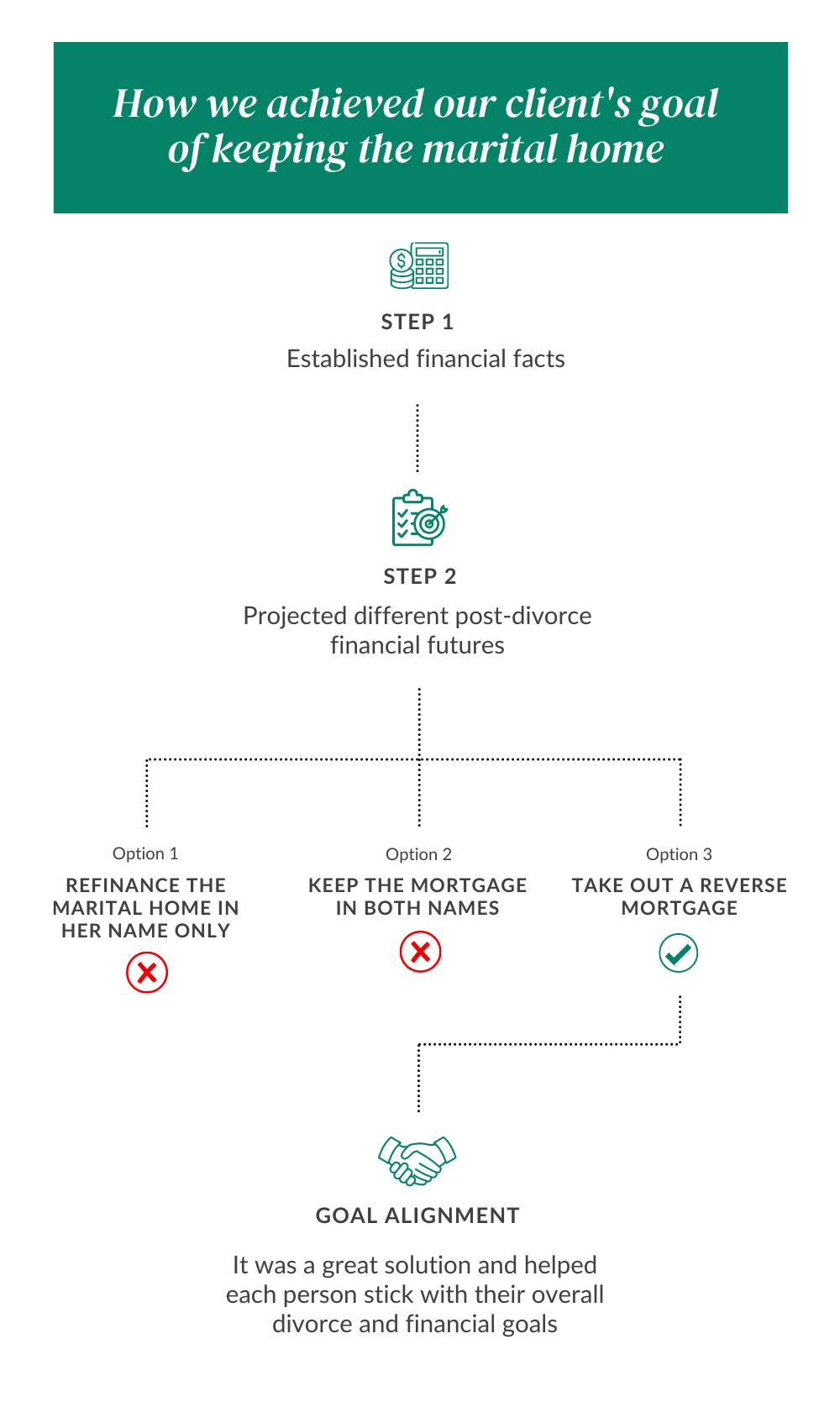 Together, she and her former spouse agreed to work with our team for joint post-divorce financial planning where the marital home became the central focus. Through mutual respect, open communication, and creative problem-solving, they explored ways to secure her future there while still respecting both of their needs.